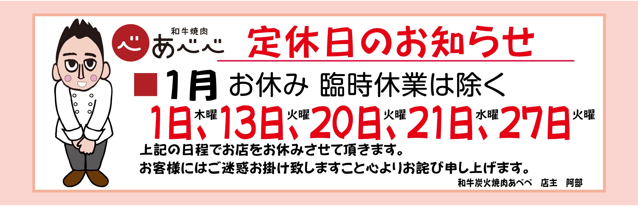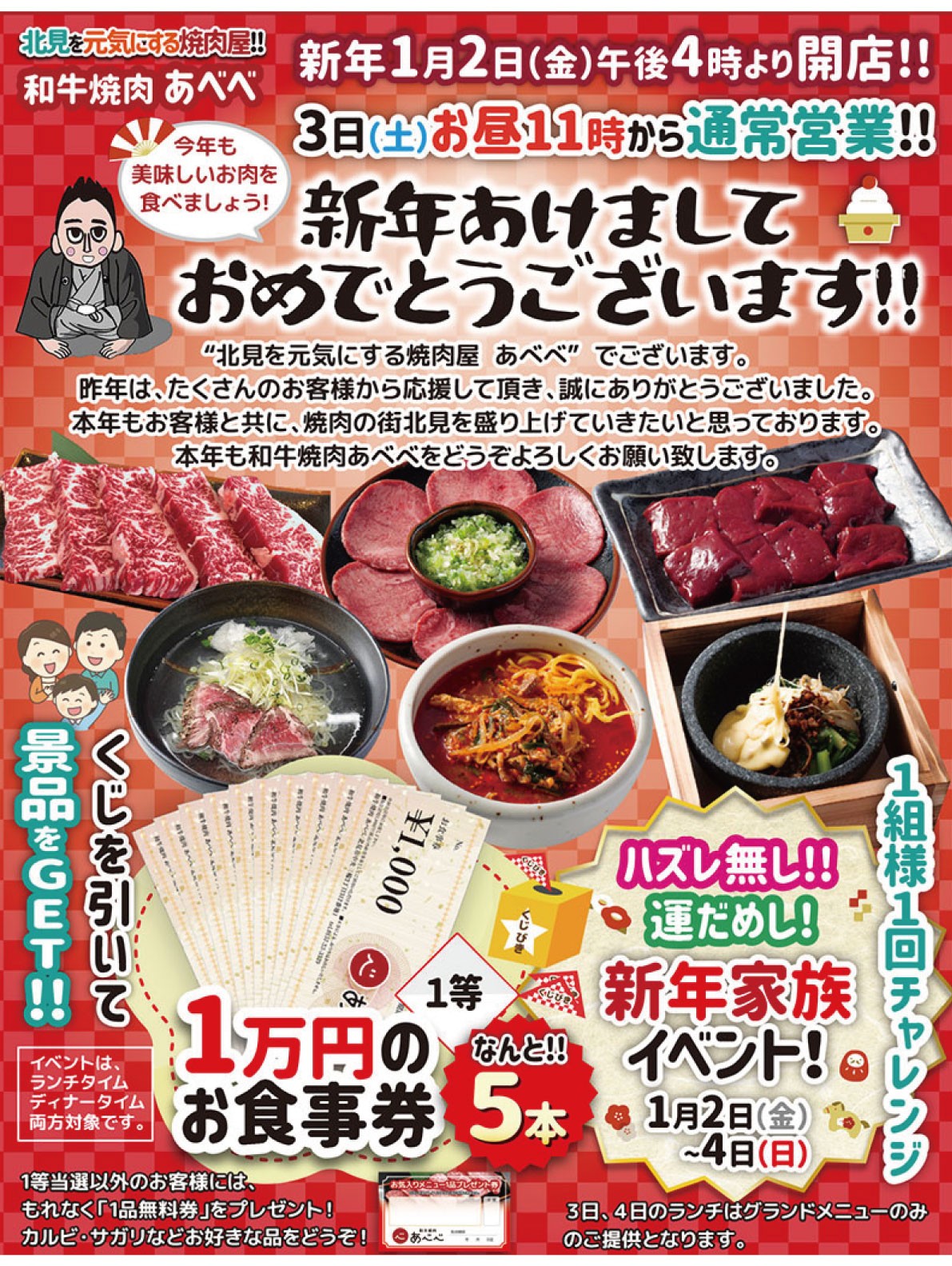定休日のご案内 「焼肉あべべ弁当」好評販売中! お昼に本格スタミナ焼肉弁当!ご注文のお電話お待ちしております! グランドメニューはコチラ 店舗情報 お電話ご予約はコチラ0157-33-3329 Google Mapはコチラfa-arrow-circle-right 店舗スタッフ募集中