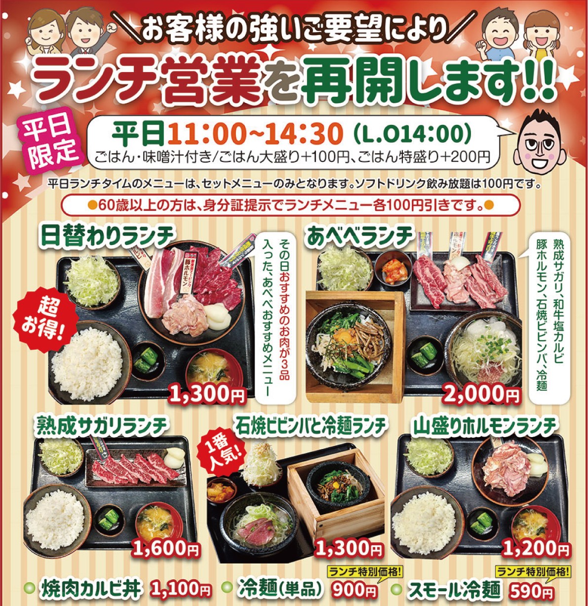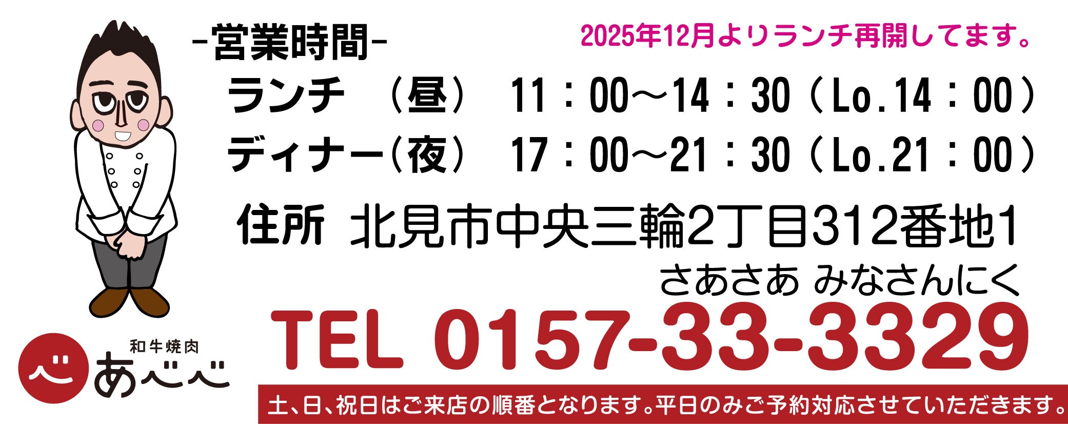 定休日のご案内 「焼肉あべべ弁当」好評販売中! お昼に本格スタミナ焼肉弁当!ご注文のお電話お待ちしております! グランドメニューはコチラ 店舗情報 お電話ご予約はコチラ0157-33-3329 Google Mapはコチラfa-arrow-circle-right 店舗スタッフ募集中