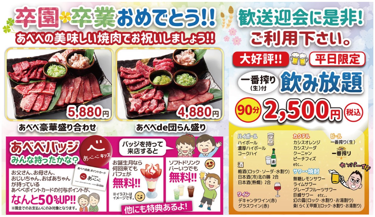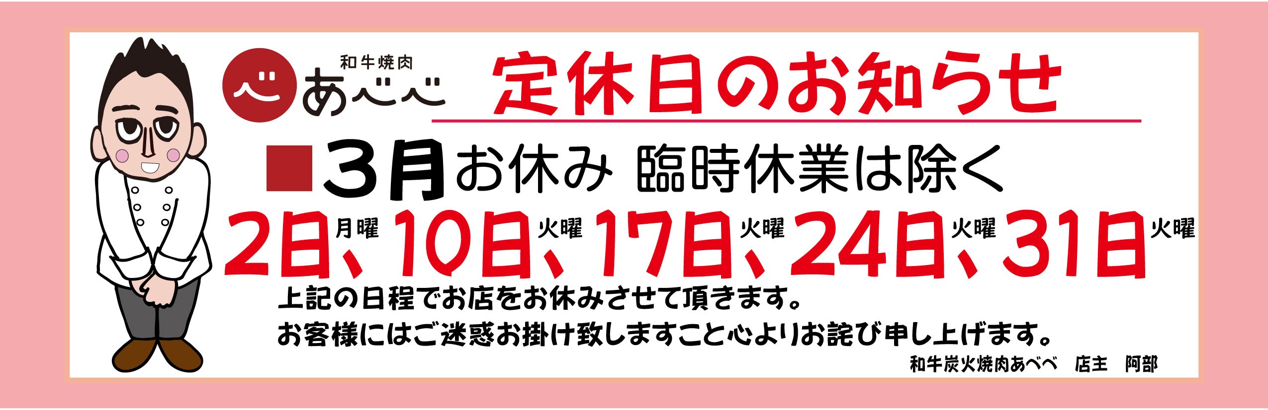 3月送迎会ご予約受付中! 定休日のご案内 「焼肉あべべ弁当」好評販売中! ※画面長押しでスマホにダウンロード出来ます。 お昼に本格スタミナ焼肉弁当!ご注文のお電話お待ちしております! グランドメニューはコチラ 店舗情報 お電話ご予約はコチラ0157-33-3329 Google Mapはコチラfa-arrow-circle-right 店舗スタッフ募集中